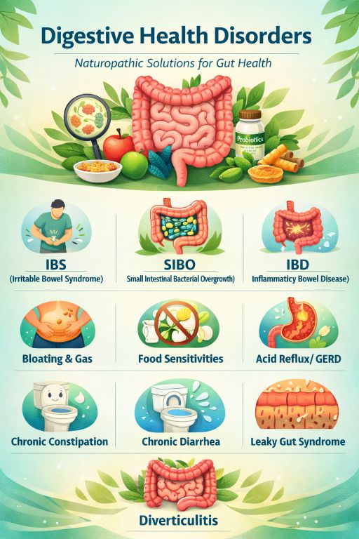 Digestive imbalances can affect nutrient absorption, immune function, and overall vitality. Naturopathic treatment supports gut health through dietary therapy, microbiome rebalancing, and anti-inflammatory protocols.